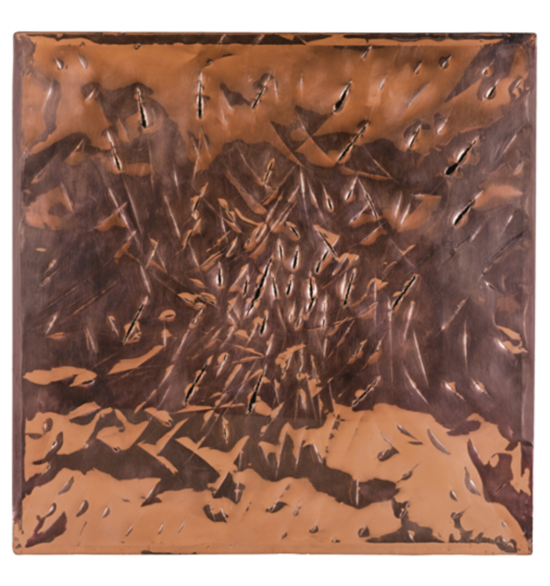 My collection needed something plain gorgeous, so I couldn't resist the sparkle of a scratched and dented sheet of copper, distressed by Italian artist Lucio Fontana in 1962 and now on offer for only $1.8 million at Helly Nahmad's Art Basel booth. Of course, the appeal of that sparkle is partly meant tongue-in-cheek: It stands for the superficial gloss that so much art has, and for a superficial reading of it. (The kind of reading art gets when someone with a wad of cash is eager to spend it.) That happy sparkle is also tempered by the violence implied in Fontana's attack on his copper.