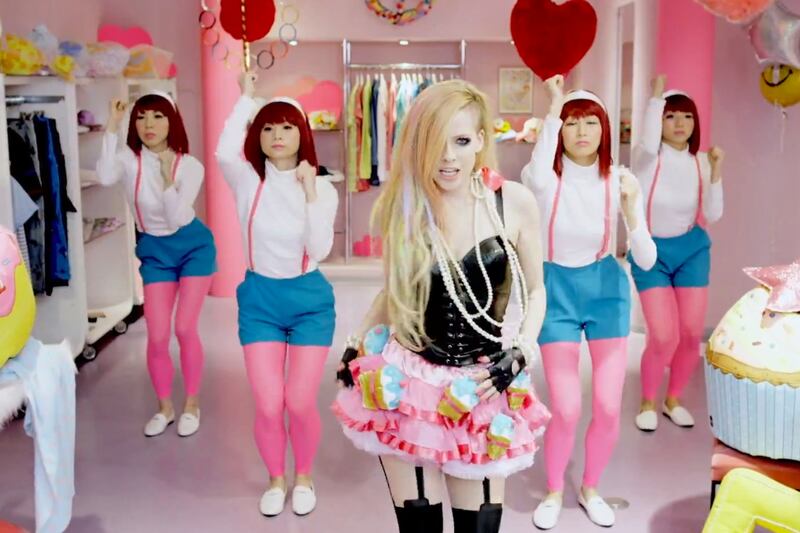 The video starts with a close up of Avril, who chants a couple of Japanese phrases with wide, black-lined badger eyes. Clearly, someone in the Lavigne camp figured out that remixing Rosetta Stone with an EDM beat would result in an insta-classic. The video proceeds to offer us a vision of a sort-of Japan, while the lyrics describe the most vague sleepover of all time. In definitely-maybe Japan, we watch a sexed up Avril zombie gyrate against a background of high-rises, cupcakes, and sushi. It's like Kyoto as envisioned by a particularly unimaginative fan of Japanese fetish porn—even the grim Asian backup dancers exude an aura of bored professionalism, like they've been forced to don pink suspenders and pose for cutesy Polaroids one too many times.