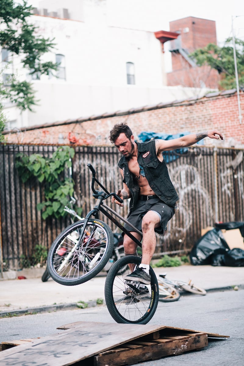 Rides a “mutant swivel bike;” Photographed at Charles Place and Myrtle Avenue, Brooklyn.
