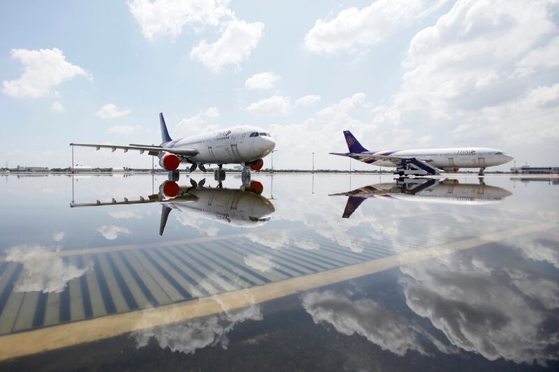 Airplanes are parked on a flooded tarmac at Don Muang Airport in Bangkok. Don Muang had to close on Tuesday.