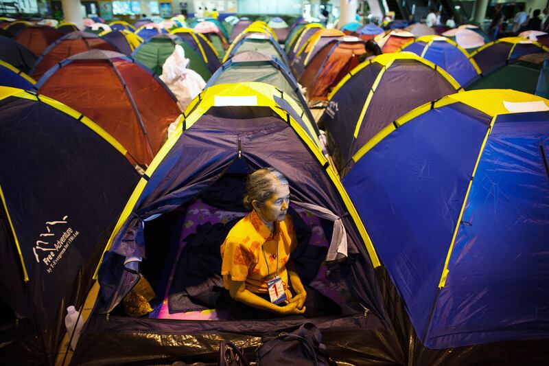 A woman stands among tents in a shelter for flood victims at the closed Don Muang Airport.