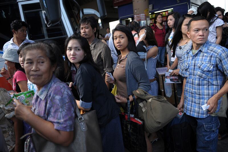 People board buses to take them away from the Thai capital.