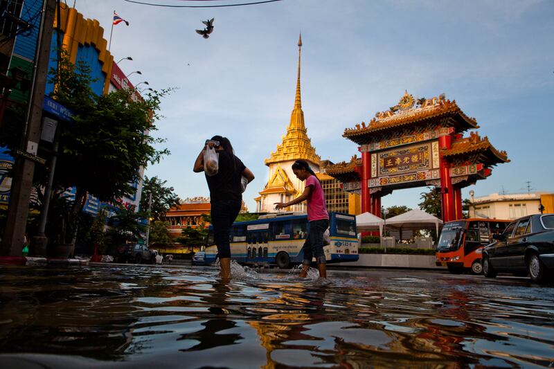 Tens of thousands of people are fleeing Bangkok ahead of rising floodwaters. The governor has officially called for residents of the three northern districts in the capital to leave, and authorities have declared a five-day holiday to allow people to relocate. With the airport already closed due to flooding, thousands of people flocked to bus and train stations. See photos of the Thai capital overwhelmed. Above: Thai residents walk on a street in Bangkok's Chinatown near the overflowing Chao Phraya River.