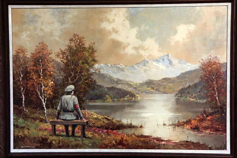 Banksy purchased the original artwork, a traditional landscape oil-painting, from the Housing Works and added his own mark—a Nazi soldier sitting on a river-side bench, gazing into the distance. The image was re-titled The Banality of the Banality of Evil, signed by Banksy, and donated back to the thrift store.