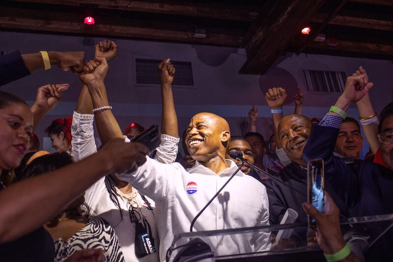 New York City mayoral candidate Eric Adams speaks during his election night party at Schimanski on June 22, 2021 in Williamsburg, Brooklyn.