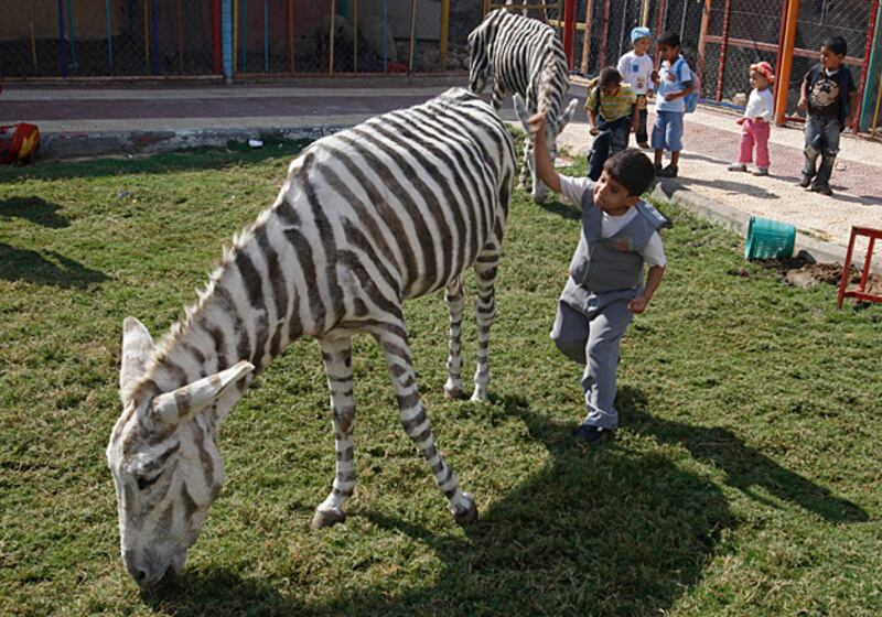 Gaza City’s Marah Land Zoo lost its two zebras to hunger during this year’s Israel-Hamas war. Enter Ahmad Barghouti, a professional painter who dyed two donkeys’ fur into zebra-like stripes, to the delight of children who sometimes enjoy rides on the “zebras'” backs. According to the Associated Press, Marah Land also features a pair of monkeys, an “aging tigress,” and a handful of rabbits, cats, and birds.