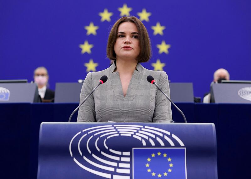 Belarusian opposition leader Sviatlana Tsikhanouskaya delivers a speech at the European Parliament in Strasbourg, France, Nov. 24, 2021.