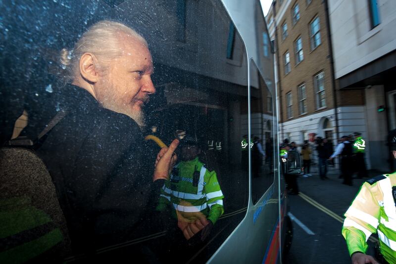 WikiLeaks founder Julian Assange arrives at Westminster Magistrates Court by police van after being arrested on April 11, 2019, in London, England.