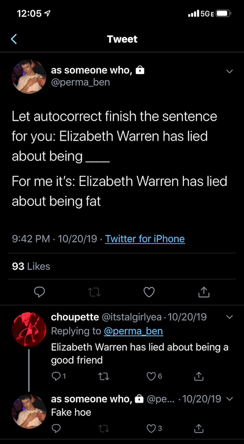 For users familiar with the patois of Gay Lefty Twitter, many of Mora’s tweets come across as fairly run-of-the-mill gay shitposts: tweets dragging the Queer Eye guys as neoliberals, mocking would-be #activist gays for shirtless photos on Instagram, or creating a meme wherein Mora’s followers share how their iPhone suggests completing the sentence “Elizabeth Warren lied about….” (Mora’s answer: “lied about being fat.”)