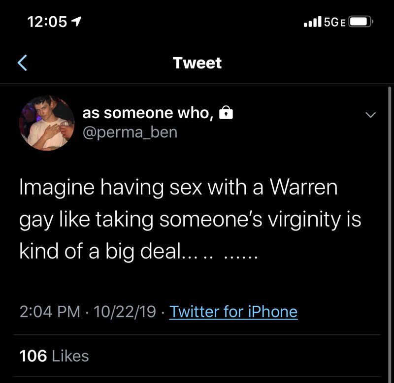 “Imagine having sex with a Warren gay like taking someone’s virginity is kind of a big deal…” Mora tweeted on Oct. 22 of last year, in a representative example.