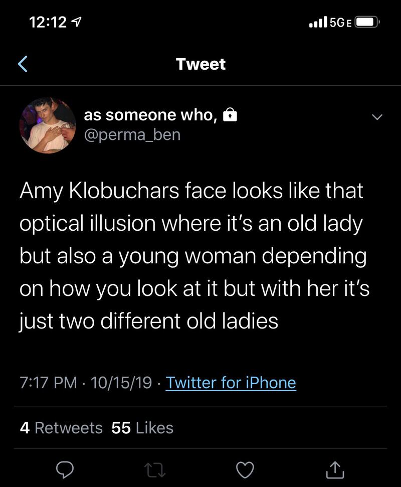 In another tweet, Mora likened Klobuchar’s face to “that optical illusion where it’s an old lady but also a young woman depending on how you look at it but with her it’s just two different old ladies.”