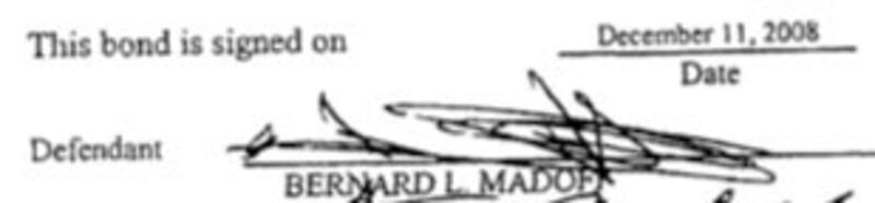 To square the circle, we also examined papers presumably signed under more stress: the bail-package documents Bernie executed in New York City Dec. 11, 2008, the day he was arrested and charged with one count of securities fraud in federal court. Ruth and Peter Madoff, his brother and his firm’s chief compliance officer, signed on Dec. 17.