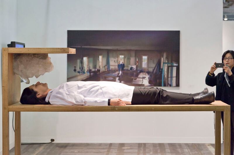 “Bed for Human Use” is a new “performed sculpture” by Marina Abramovic, on view in the Armory Show booth of Sao Paulo’s Luciana Brito gallery. There is something quietly intense about the piece. Its silent performer studiously ignores the Armory’s sales-floor atmosphere, and helps remind fairgoers that quiet times are not yet an impossible dream. (A gallery rep told me that a collector isn’t obliged to man the sculpture at all times, although it is only complete with its sleeping figure in place and dressed according to instructions provided by the artist.)