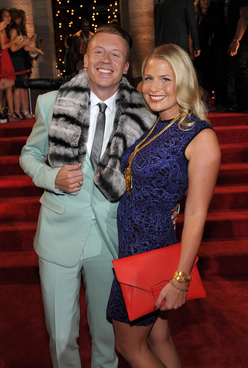 Rapper Macklemore arrived at the awards prom ready in a seafoam green suit, white button-down, and skinny gray tie. He topped the ensemble off with a fur scarf.
