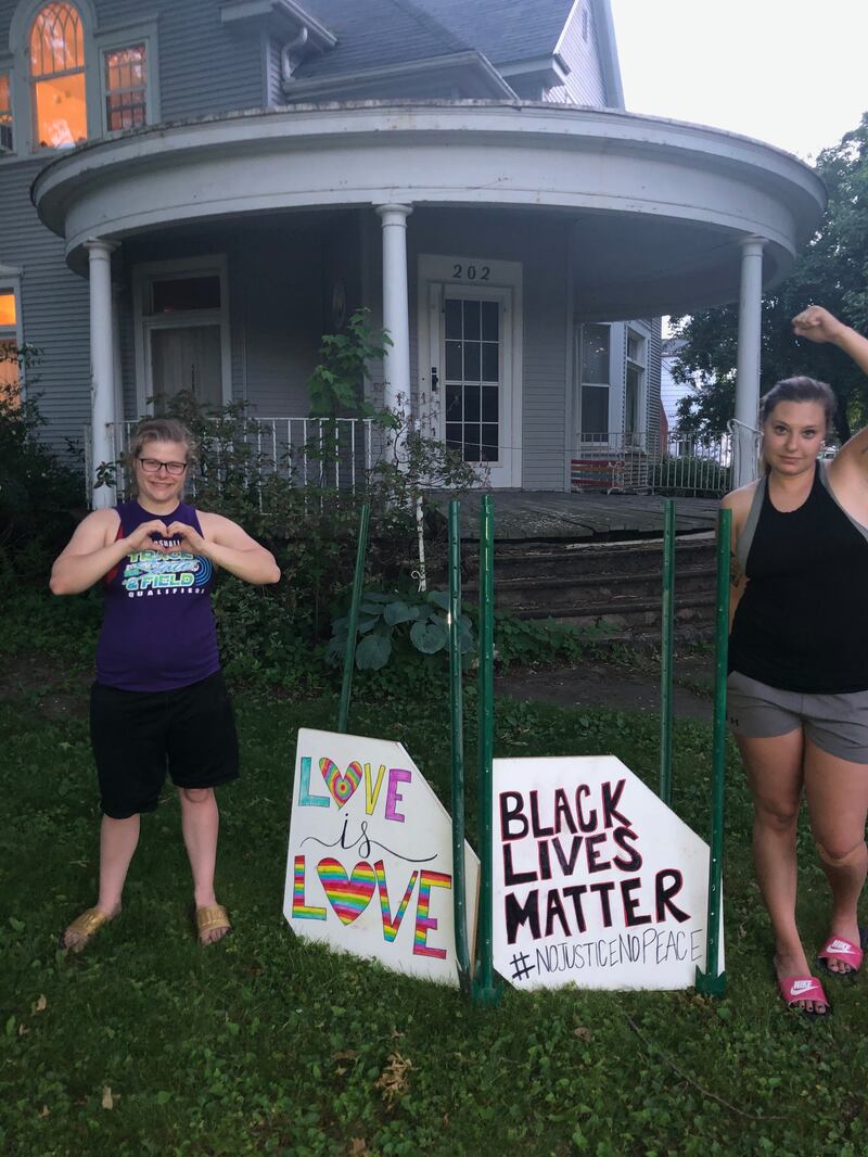 The book inspired Maggie and Mady to make Black Lives Matter yard signs that the family placed on their front lawn, along with a “Love is Love” sign. “I’m not kidding how many guys — one guy has a Confederate flag and a Trump flag in his truck, rode by and stopped to take pictures of it and were kind of freaking out. So now my old white neighbor across the street put All Lives Matter on a board, a kind of visual art, facing my house. So that’s some kind of fun.”