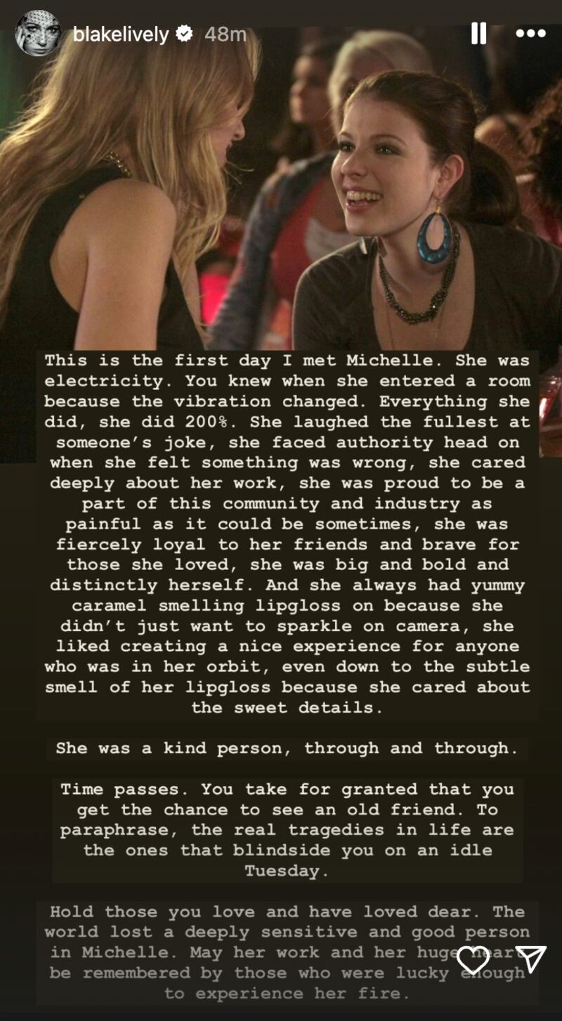 “The world lost a deeply sensitive and good person in Michelle,” Lively concluded. “May her work and huge heart be remembered by those who were lucky enough to experience her fire.”