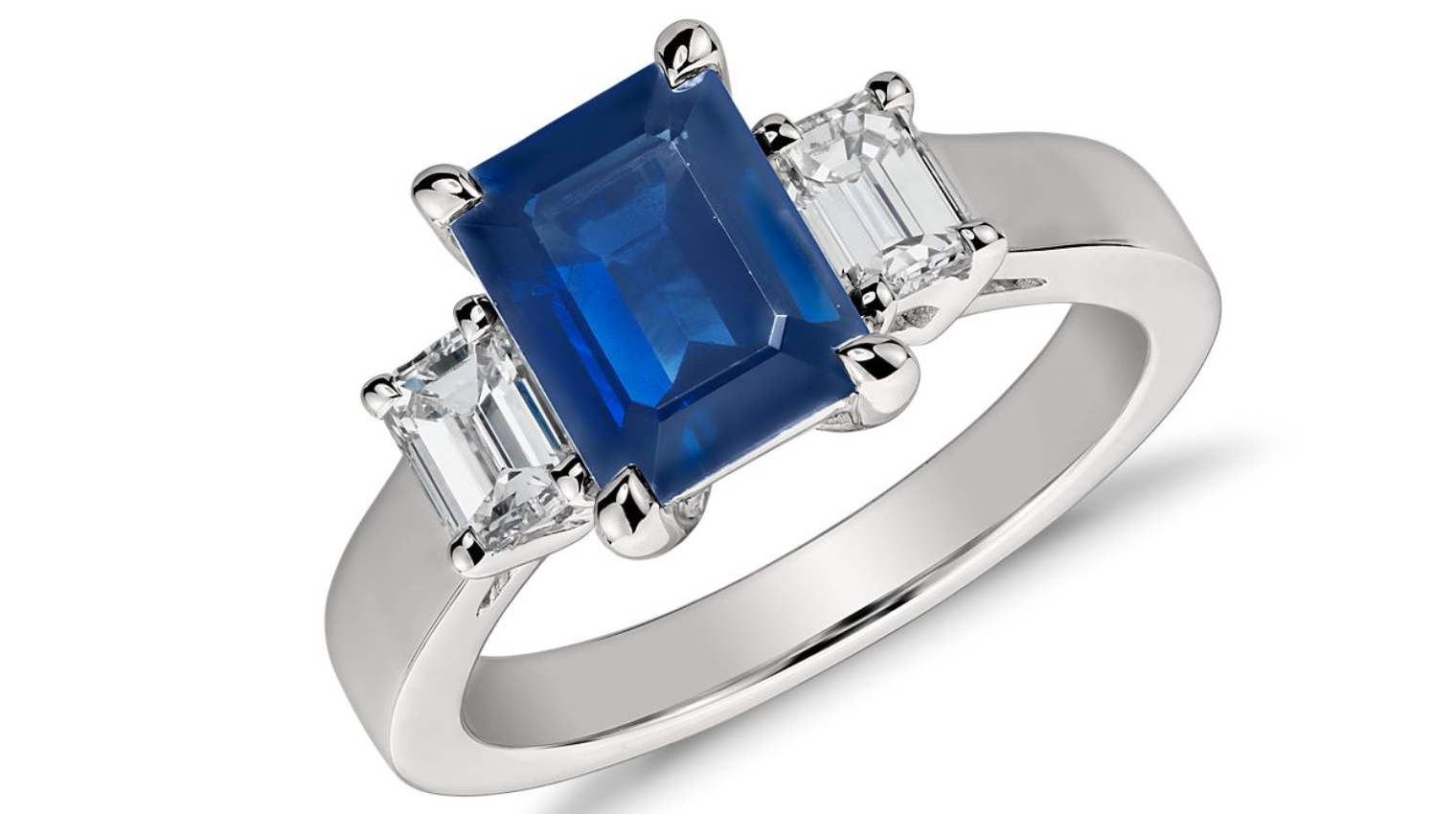 If you’re looking to make a statement, this is the ring to do it with. This exquisite piece has an eye-catching sapphire centerpiece complemented by two matching emerald cut diamonds, all set in platinum. Onlookers will need sunglasses to stare directly into this rock.