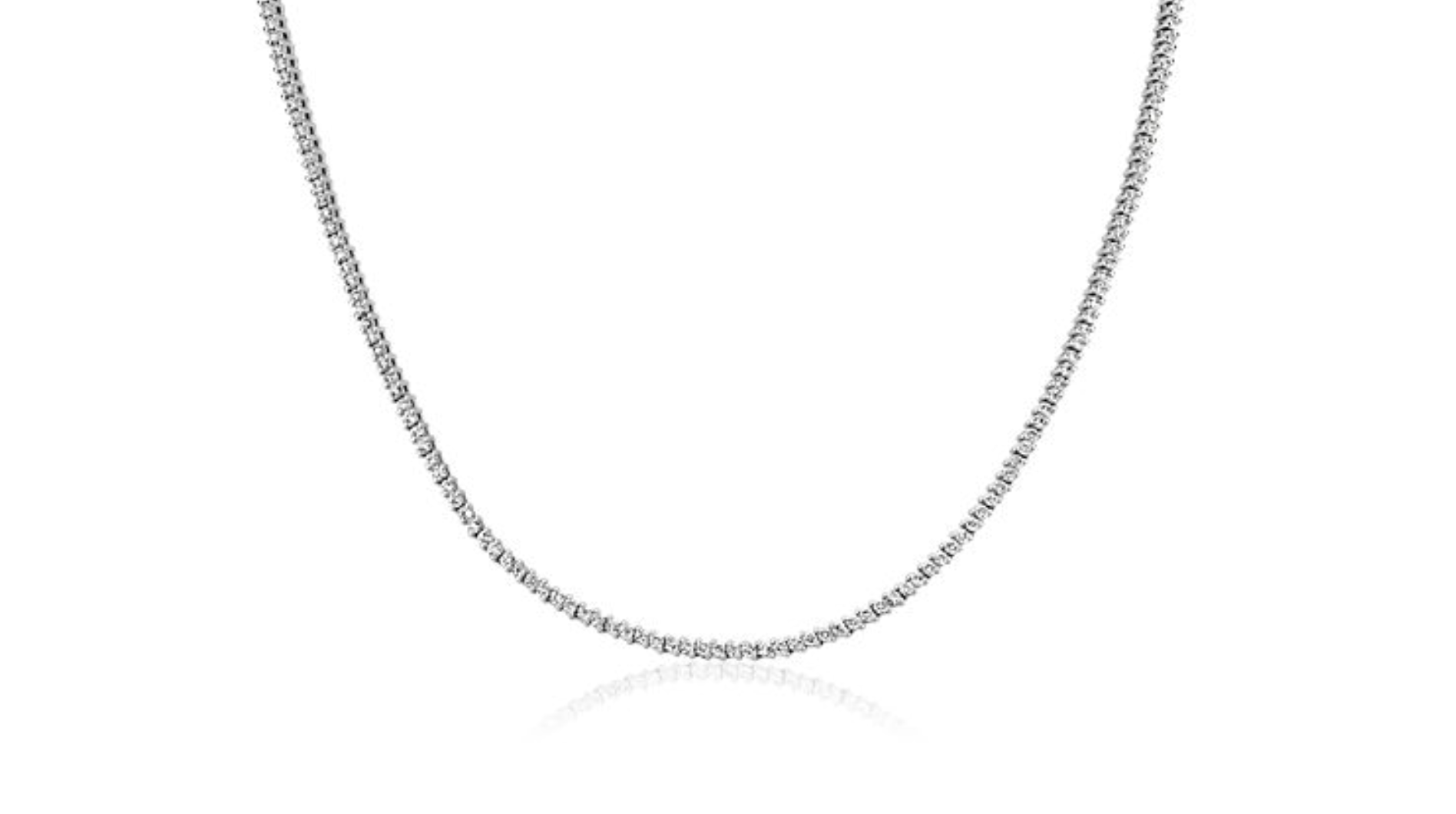 Round-cut diamonds run along the length of this gorgeous eternity necklace that shimmers brilliantly in the light. The necklace is a statement piece for any formal attire and the kind of gift that will be talked about for years to come.