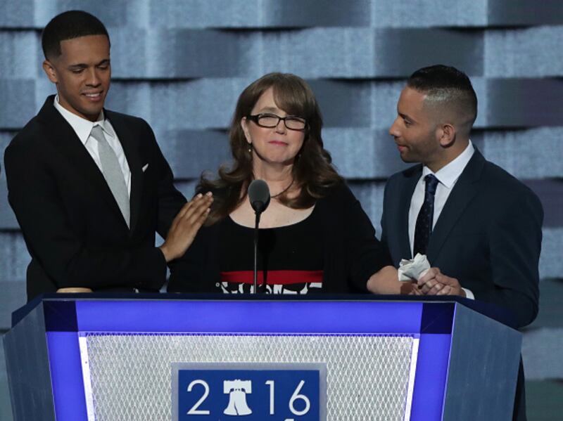 Christine Leinonen, mother of Christopher 'Dru' Leinonen, is comforted by Brandon Wolf (L) and Jose Arriagada (R), survivors of the attack at the Pulse nightclub in Orlando, as they stand on stage during the third day of the Democratic National Convention at the Wells Fargo Center, July 27, 2016 in Philadelphia, Pennsylvania.