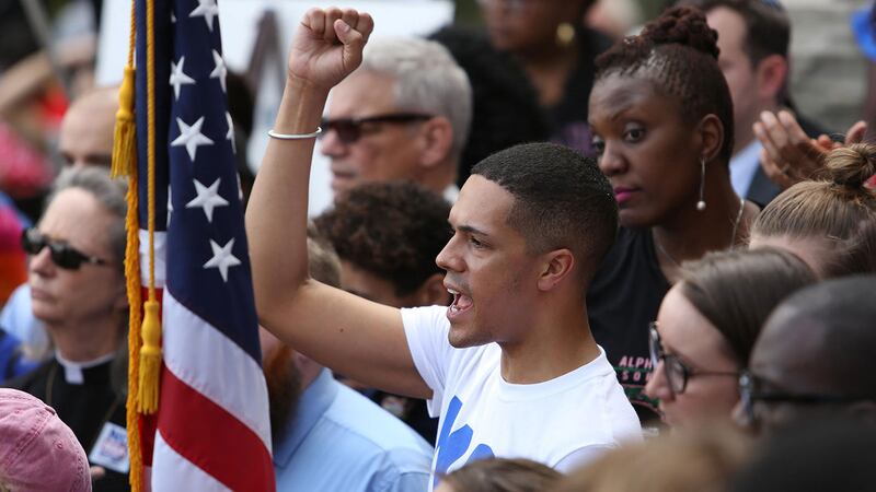 Brandon Wolf, a survivor of the Pulse night club mass shooting, speaks during a protest about gun violence outside the National Rifle Association on July 14, 2017 in Fairfax, Virginia.