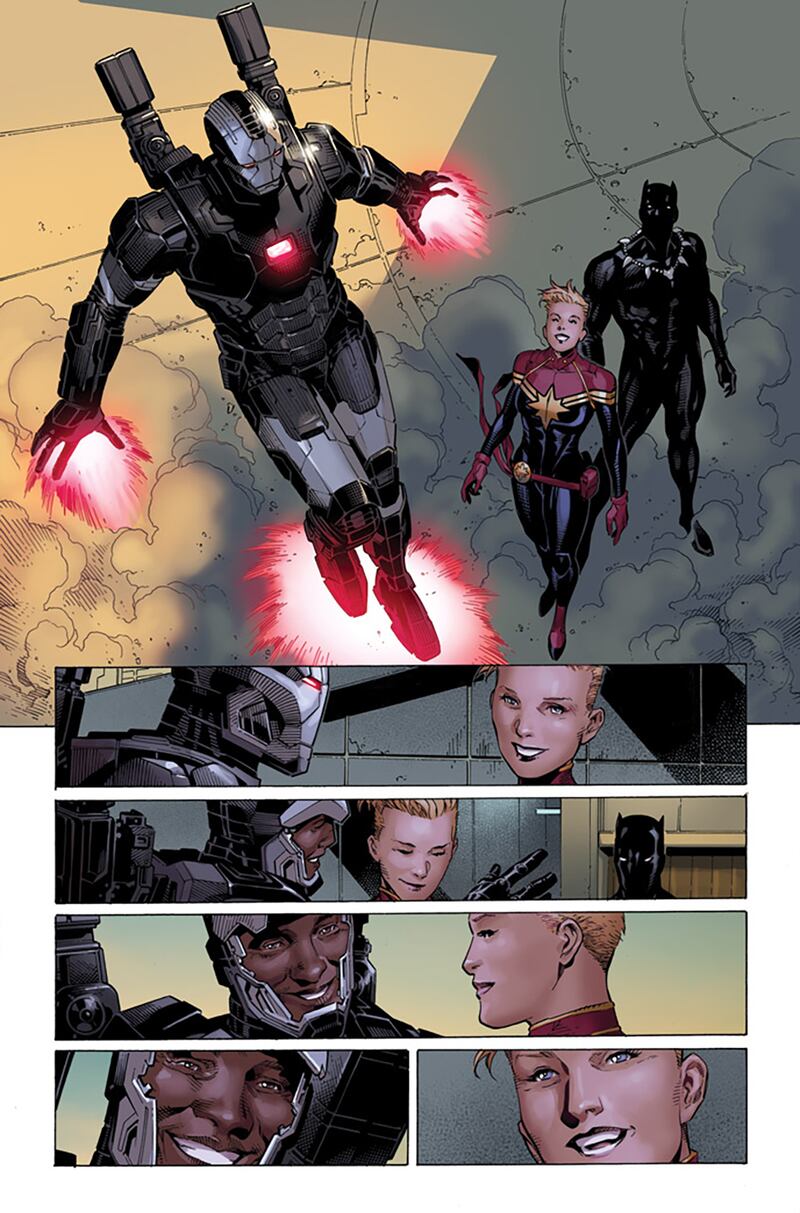 I was aware of what happened to Rhodey in the Civil War movie when we were putting this book together. The idea of an inciting incident that could equally affect both Tony and Carol very personally was something I wanted to do. I wanted them on equal emotional footing. And, oh my god, guess who is Tony’s best friend and Carol’s sometimes lover? Both Tony and Carol could say of their actions, “Rhodey would want this,” and they would both maybe be right. I didn’t want to do anything too close to the movie but at the same time there just was no other character that could represent something so meaningful to both leading characters.
