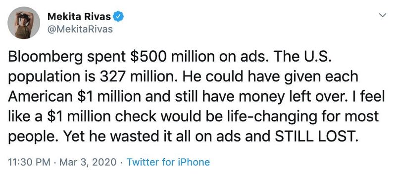 “When I read it tonight on social media, it kind of all became clear,” Williams confidently declared. “Bloomberg spent $500 million on ads. U.S. Population, $327 million. Don’t tell us if you’re ahead of us on the math. He could have given each American $1 million and have had lunch money left over. It’s an incredible way of putting it.”