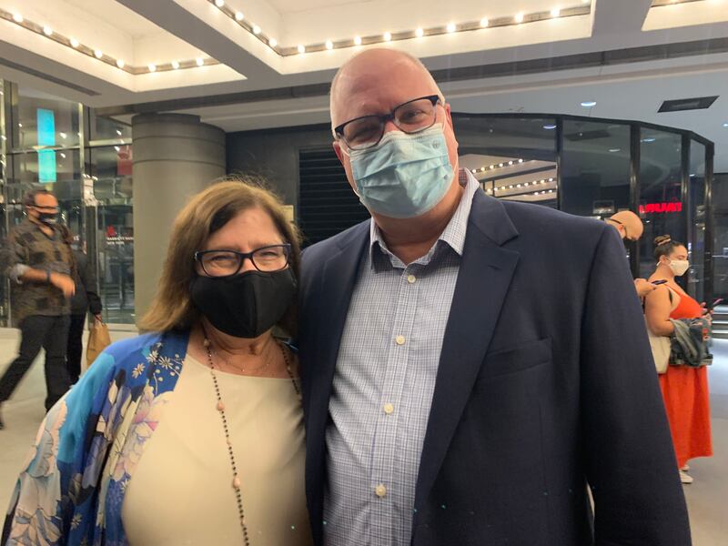 Karen and Matthew Johnston from Florida had seen the show a number of times. Karen, a producer, said she was “a little nervous” about the evening, and how things would go “with protocols and numbers of people,” but was still planning many more theater visits. “I’m very vaccinated. I’m good,” she laughed.