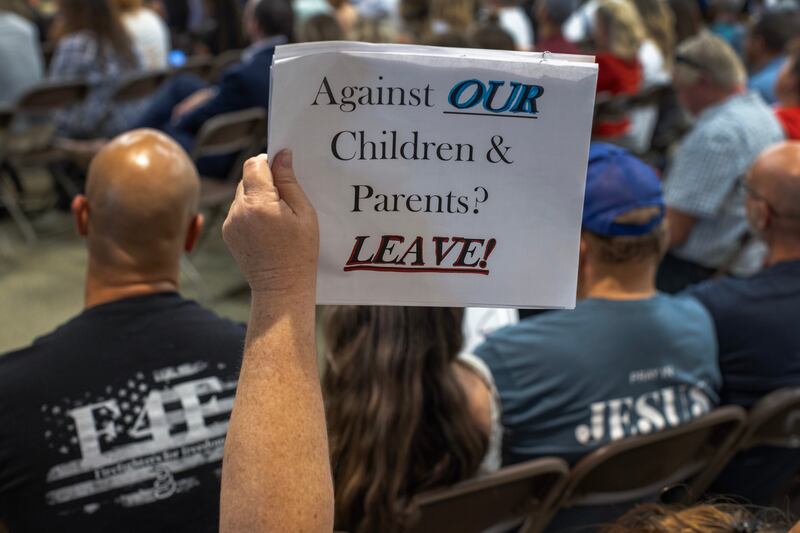 At the July board meeting that attracted far-right extremists like the Proud Boys, some local parents pushed back against the church’s connections to the school board.