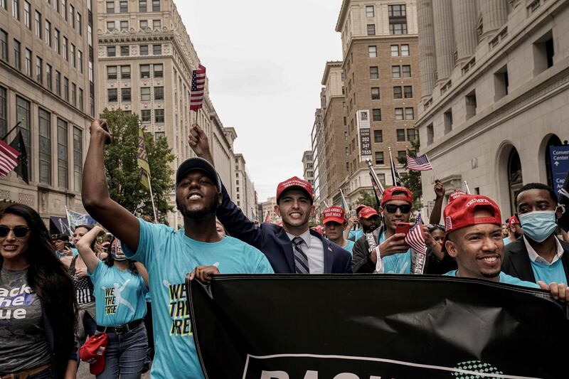 "Supporters of U.S. President Donald Trump rally and march on the Ellipse and the streets around the White House after the president's campaign rally on the South Lawn of the White House in Washington, October 10, 2020. REUTERS/Ken Cedeno"