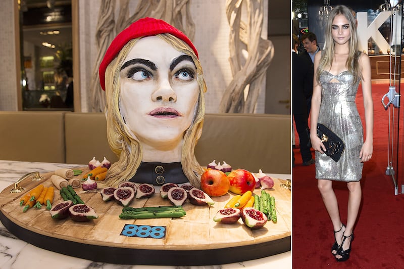 Cara Delevingne's Face Gets Made Into a Cake: Winner of Britain's 888Casino Millionaire Gene Jackpot Steve Winters thought he had all the luck when he won a lunch with supermodel Cara Delevingne—or so he thought. Winters was shocked when he discovered he was having lunch with Cara Delevingne … made out of cake. The life-size version of Cara's head, created by celebrity chef Aldo Zilli, even sported the model's signature bushy brows and red beanie. [The Telegraph]