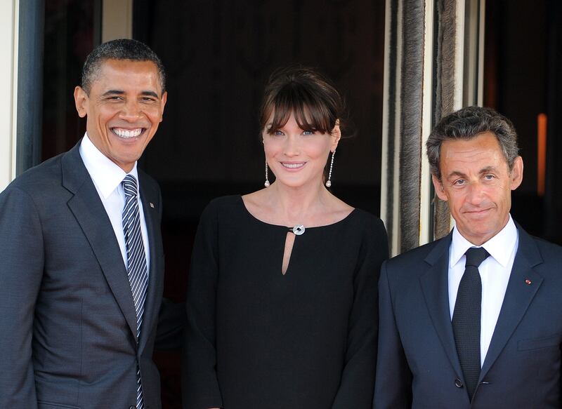 French President Nicolas Sarkozy (R) and his wife Carla Bruni-Sarkozy (C) greets U.S. President Barack Obama on May 26, 2011.
