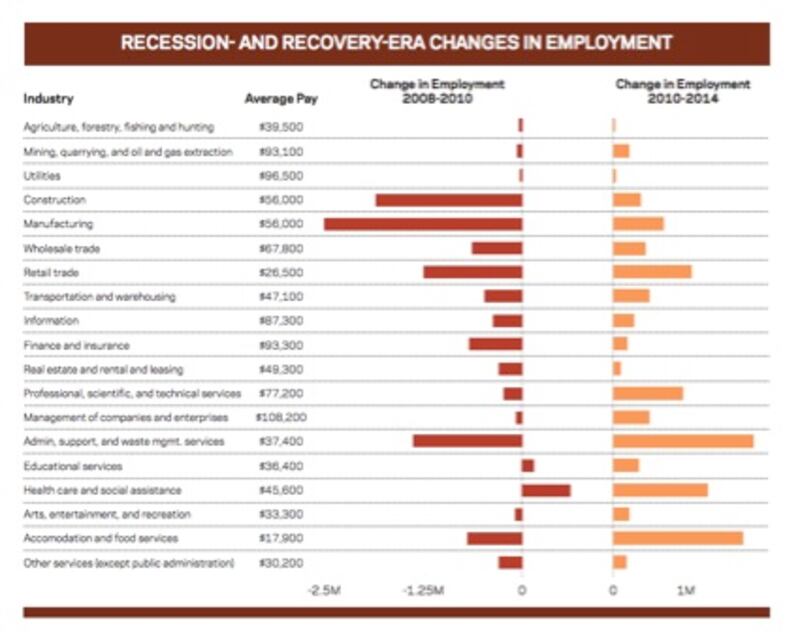 The map of entrepreneurship is shrinking, too. Since the recession, start-up activity has become much more highly concentrated in a few super-performing geographic areas. Consider this: fully half of the national increase in business establishments from 2010 to 2014 occurred in only 20 counties, 17 of which were located in just four states: California, Florida, New York, and Texas. Many regions, including large swathes of the Rust Belt, are struggling to seed the new industries needed to replace the millions of manufacturing and construction jobs lost during the recession.