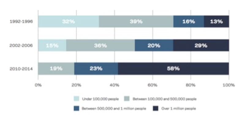 Size and density are driving much of the concentration. In the 1990s and 2000s, counties with more than 1 million people generated less than a third of net business formation. Today, those counties are responsible for almost 60 percent of the economy’s net new businesses—more than quadruple their 1990s share.