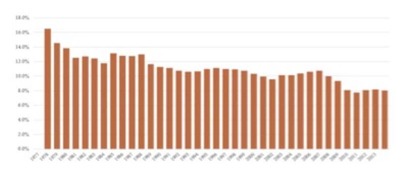 Entrepreneurs perhaps never have been more celebrated in American culture than they are today. But that popularity is at odds with a startling long-term trend: The U.S. economy has been getting less entrepreneurial for decades. From 1977 to 2013, startups as a share of all firms fell from 16.5 percent to 8.0 percent. The decline is pervasive across all sectors, including high tech.