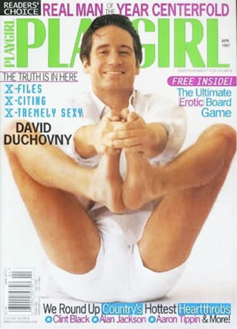 X-Files devotees spent an anguishing nine years waiting for Mulder and Scully to jump into bed together, but David Duchovny told Playgirl in April 1997 that that plotline would have been too easy. "What's so hard about having sex?" he asked. The Princeton- and Yale-educated actor appears in a cheeky cover but did not pose for Playgirl. He spoke to the magazine about appearing "bare-assed" in Kalifornia and The Rapture. Duchovny, said he felt "exposed," but also has no qualms about full-frontal scenes. "Why should I? It's just what it is."