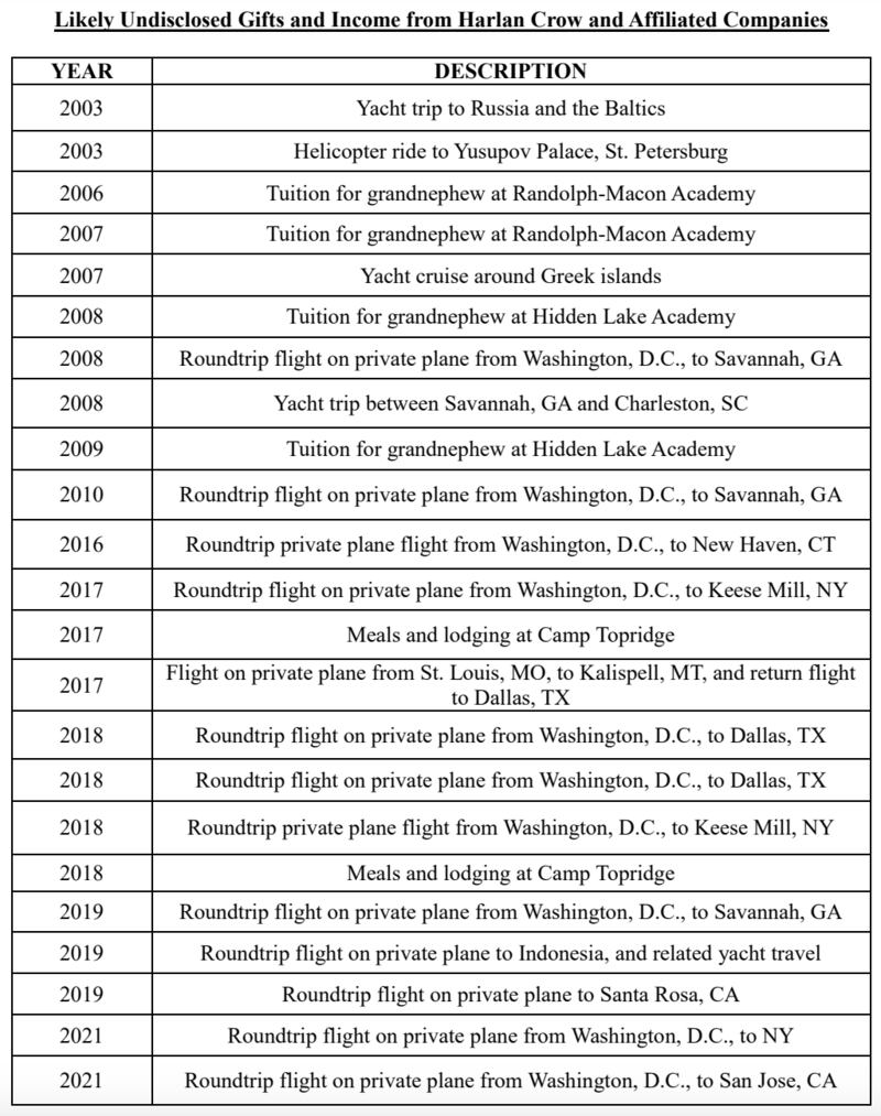 Thomas, for his part, belatedly disclosed some—but not all—gifts from Crow this year and has defended the gifts as “personal hospitality” from some of his and his wife’s “dearest friends.”