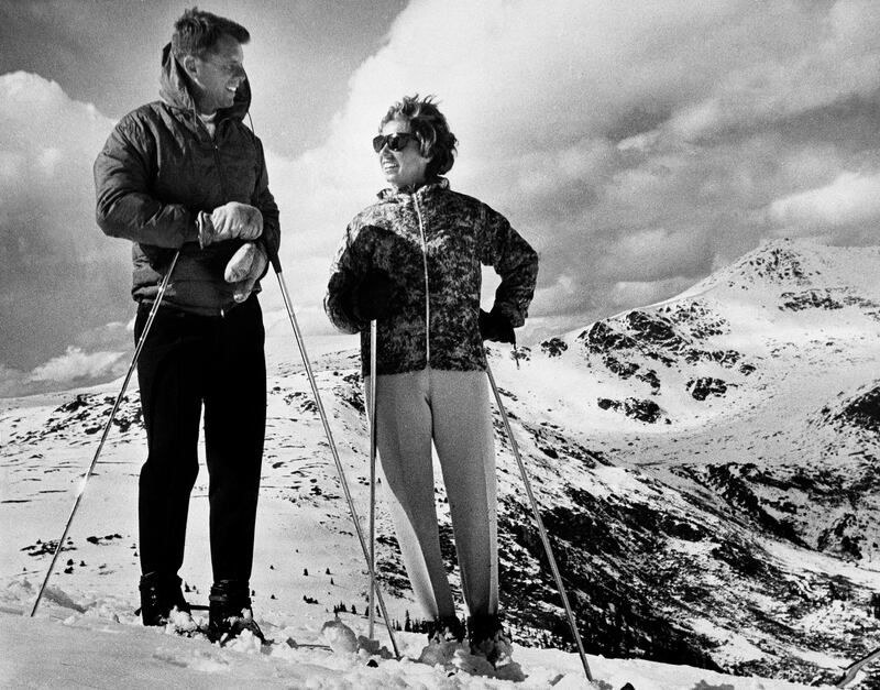 United States Attorney General Robert F. Kennedy and his wife, Ethel, view the Continental Divide while skiing at Independence Pass on October 2, 1961 in Aspen, Colorado.