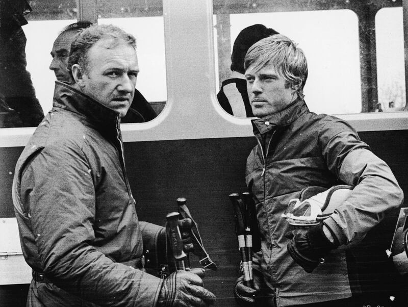 American actors Gene Hackman and Robert Redford hold ski poles during a scene from the film Downhill Racer directed by Michael Ritchie in 1969.