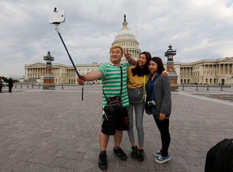 South Korean tourists Heemok Ann, Eunyi Ji, and Mijung Jung take their own picture on the empty street in front of the U.S. Capitol dome on Capitol Hill.