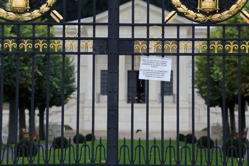 A notice advising visitors in English and French that the American Cemetery is closed due to the partial shutdown of the U.S. federal government hangs from the gates of the cemetery in Suresnes, west of Paris.