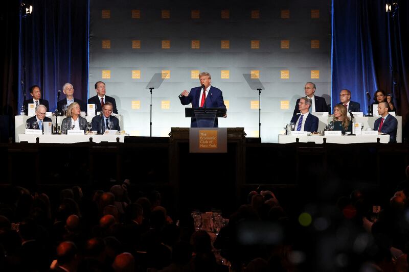 Quick (front row, right) was on the stage as Trump addressed the Economic Club of New York. She called aspects of his plans “crazy.”