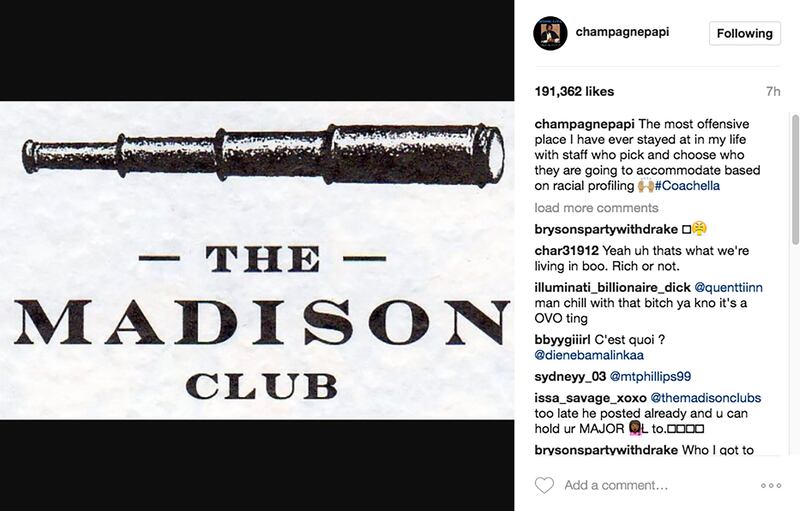 This year, Drake wasn’t even on the official Coachella lineup. Presumably, he hauled ass to the California desert to make some surprise on stage appearances and bear witness to Rihanna’s great outfits. So imagine Drake’s dismay when faced with alleged discrimination from the exclusive Madison Club during his damn vacation. In a now-deleted Instagram, Drake shared a picture of the residential community/golf club’s logo, captioned, “The most offensive place I have ever stayed at in my life with staff who pick and choose who they are going to accommodate based on racial profiling #Coachella.”