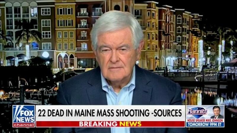 In a refrain we’ve heard time and time again after yet another horrific American mass shooting, Fox News made sure to immediately react to the massacre in Lewiston by standing up for the true victim: guns. With residents still sheltering in place on Wednesday night, Fox News contributor Newt Gingrich raged about the need for more firearms and less restrictive gun laws to combat these increasingly common tragedies. “We have to have a greater ability for our citizens to protect themselves,” he declared, prompting Sean Hannity to agree with him “100 percent.” Speaking of Hannity, the Fox News star used the mass shooting to tout his own “personal security plan,” which included his supposed MMA prowess. “I train in mixed martial arts,” he said. “I've been a big believer in the Second Amendment for a long time, with the prayer that I would never have to use it.” Jesse Watters, meanwhile, stuck with the tried-and-true conservative media mantra of “guns don’t kill people, people kill people,” before adding his own little analogy. “Forks don't make you fat,” he insisted. (Later that night, Watters continued to treat the tragic shooting in a sober manner, agreeing with reality TV star Dog the Bounty Hunter that the Marines should invade Maine to find the shooter.) Elsewhere in the right-wing industrial-outrage complex, MAGA pundit Charlie Kirk reacted to the shooting by urging his audience to heavily arm themselves because “evil is everywhere” and “you need to be prepared to defend yourself and your family.”
