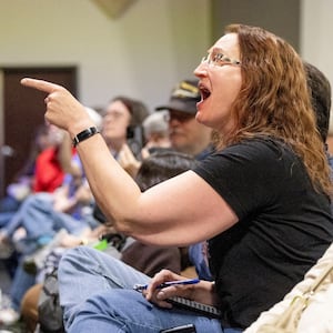 In all, at least six attendees were escorted from the town hall “without issue,” the Acworth Police Department confirmed Tuesday night. Three people were arrested, two of whom had tasers deployed on them “in the process,” cops said. They added: “While attempting to remove the subjects from the event, officers were threatened, physically resisted, and harmed in the process.”