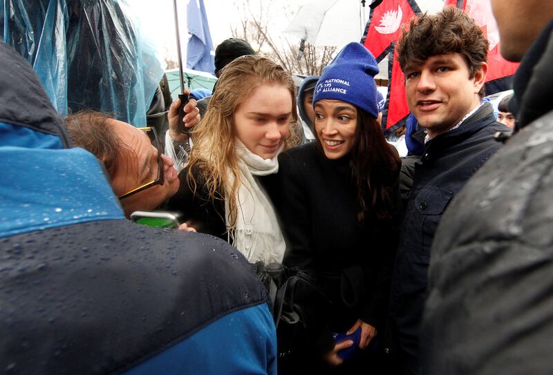 Rep. Alexandria Ocasio-Cortez (D-NY) talks with a man in the crowd as she squeezes between her Deputy Communications Director Anika Legrand-Wittich (L) and her Communications Director Corbin Trent (R).