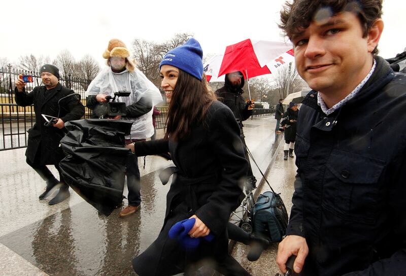 Rep. Alexandria Ocasio-Cortez (D-NY) walks away with her then Communications Director Corbin Trent (R).