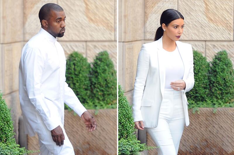 Who can forget the 2001 American Music Awards, when then-idyllic couple Justin Timberlake and Britney Spears took to the red carpet in matching Canadian tuxedos? Or the numerous times Posh and Becks sported nearly identical looks, from the purple ensembles worn at their wedding reception to completely leather Versace get-ups. Kim Kardashian and Kanye West coordinate their colors and cuts all the time. Even Will and Kate have been seen in a matching look or two.