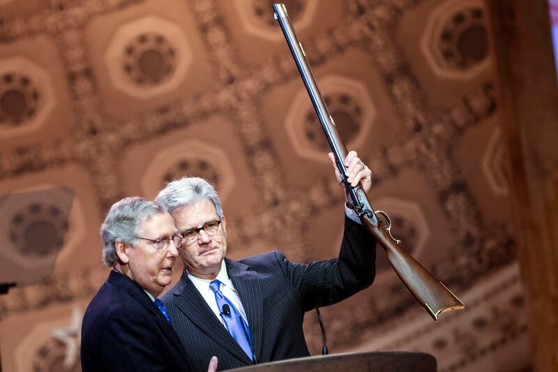 I take that back. The one thing that may have tickled them more was when Mitch McConnell showed up on stage brandishing a rifle. (It was a gift for colleague Tom Coburn, who is retiring this year because of health problems.) The crowd was delighted. Alas, that was pretty much all that McConnell did that delighted them, because a) everyone at CPAC knows the minority leader increasingly loathes the right-wing of the party and is desperately smooching their backsides only because of that unfortunate primary battle brewing back in Kentucky, and b) McConnell is about as charismatic as a box of stale prunes.