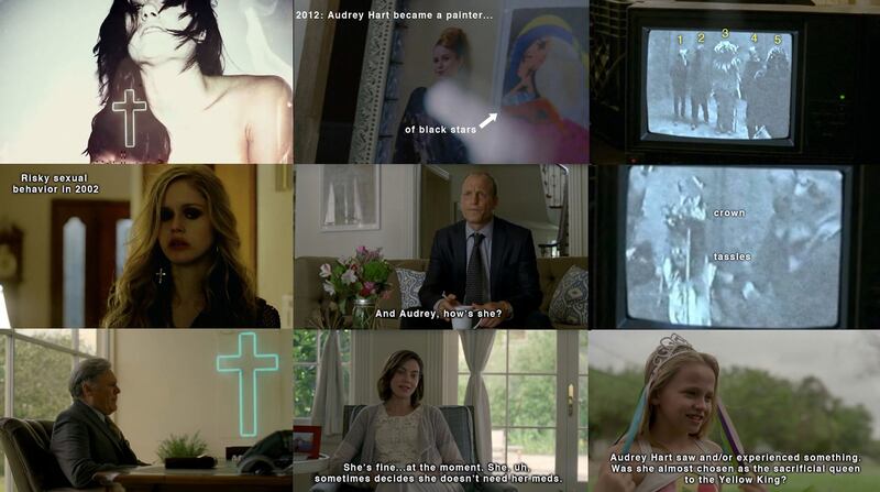 There’s a great deal of evidence suggesting that Audrey (Erin Moriarty), Marty’s eldest daughter, will meet a grave end in the True Detective finale. Here’s what we know: the picture in Dora Lange’s house of a young blond girl surrounded by the “Five Horsemen” looks an awful lot like young Audrey; when Audrey was a child in ’95, she was punished in school for scribbling drawings of people having sex in her notebook. In one of the drawings, a masked man is depicted, while in others, the women appear to be wearing some sort of animal mask. When young Audrey is questioned by her parents about how she came up with the images, she cries, but remains mum; there’s a spiral drawing (echoing the spiral tattoo on Dora’s back) hanging in the Hart kitchen in 1995; a picture of Audrey next to a painting of hers in 2012 depicting a character sporting black stars, similar to the tattoos on the aforementioned prostitute in Episode 2; there are identical flower paintings on the wall of the psychiatric ward Rust visits in 2002, and a framed painting in Marty’s bedroom; and Audrey sported a crown with tassles in 1995 that’s very similar to the ceremonial crown seen on the gang rape victim in the disturbing video that Rust shows Marty in the shed.