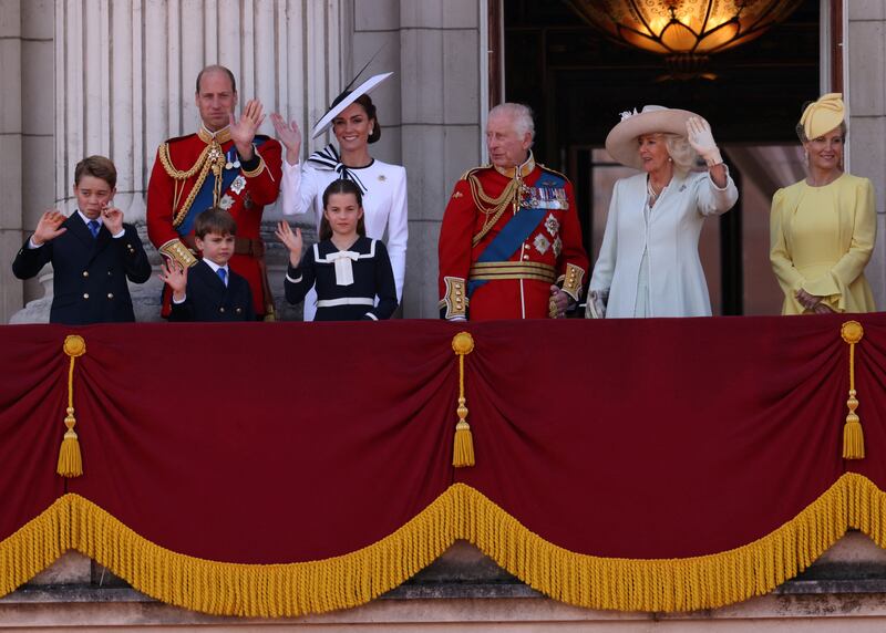 King Charles is joined by Queen Camilla, William, Prince of Wales, Catherine, Princess of Wales, Prince George, Princess Charlotte, Prince Louis, and Sophie, Duchess of Edinburgh, on the balcony of Buckingham Palace as part of Trooping the Colour, June 15, 2024.